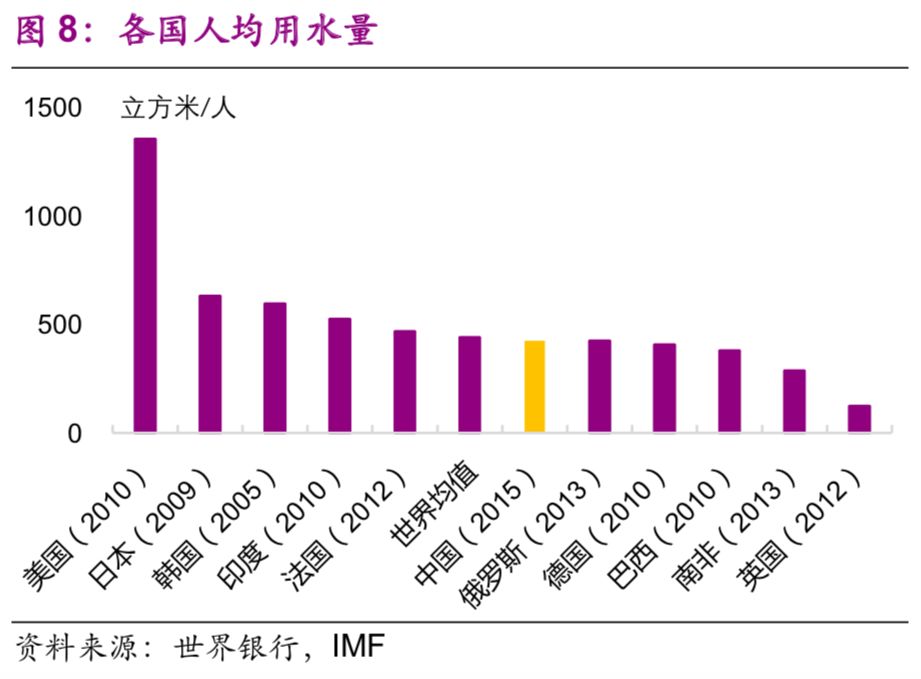在用電與用水方面,中國的人均水平仍然較低,與人均GDP水平相適應(yīng)。中國人均用電量和人均用水量分別為3927千瓦時/人(2014年數(shù)據(jù))、425立方米/人(2015年數(shù)據(jù)),與世界平均水平(3966千瓦時/人、442立方米/人)大致相近,也與中國的人均GDP水平相適應(yīng),是美國(12984千瓦時/人、1357立方米/人)的30.2%、31.4%(圖7、8)。