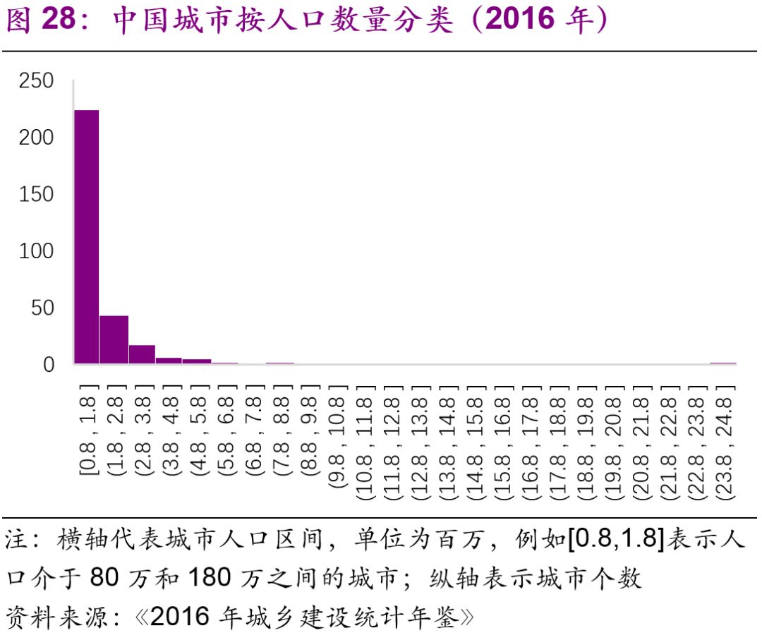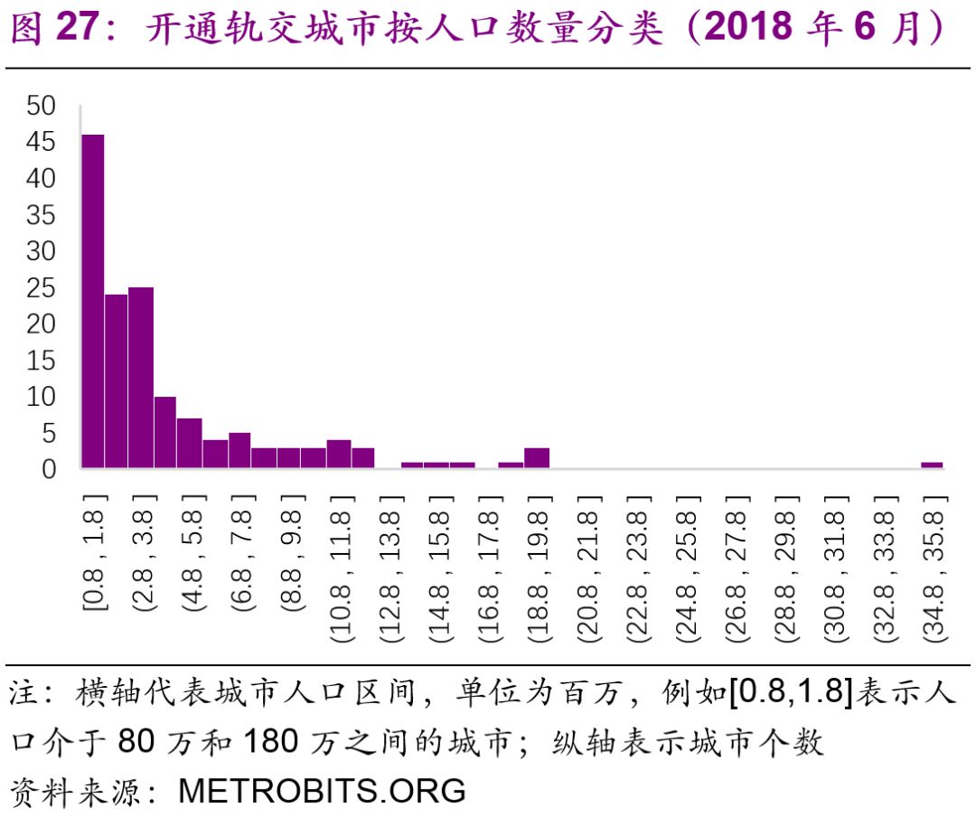 擬建地鐵、輕軌線路初期客運(yùn)強(qiáng)度分別不低于每日每公里0.7萬人次、0.4萬人次,遠(yuǎn)期客流規(guī)模分別達(dá)到單向高峰小時3萬人次以上、1萬人次以上。但是同時也強(qiáng)調(diào)了:“以上申報條件將根據(jù)經(jīng)濟(jì)社會發(fā)展情況按程序適時調(diào)整?!?016年,中國城市中市區(qū)常住人口在150萬以上的城市共有111個,對比目前已經(jīng)開通軌道交通的城市數(shù)量(34個),仍有一定的發(fā)展空間。而從國際上看,建設(shè)軌道交通的城市人口的起點(diǎn)[19]大約為100萬(圖27),如果長期內(nèi)中國將建設(shè)軌道交通的人口標(biāo)準(zhǔn)下調(diào)至100萬,那么將有225個城市符合標(biāo)準(zhǔn)(圖28)。