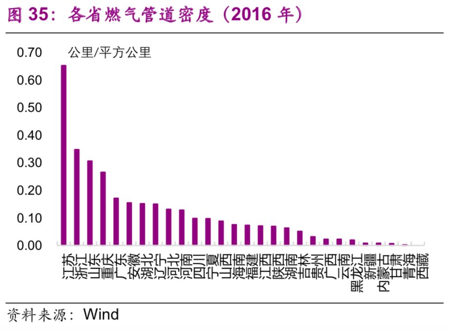 管道長度遠(yuǎn)低于美國等國家。2016年,中國的管道長度為12.6萬公里,大幅低于美國(222.5萬公里,2013年數(shù)據(jù))、俄羅斯(26.0萬公里,2007年水平)(圖20)。從密度和人均水平上來看,2016年中國管道密度為0.013公里/平方公里,與日本(0.013公里/平方公里)、俄羅斯(0.016公里/平方公里)相當(dāng),但遠(yuǎn)低于美國(0.24公里/平方公里)、英國(0.16公里/平方公里)等西方發(fā)達(dá)國家(圖9);
