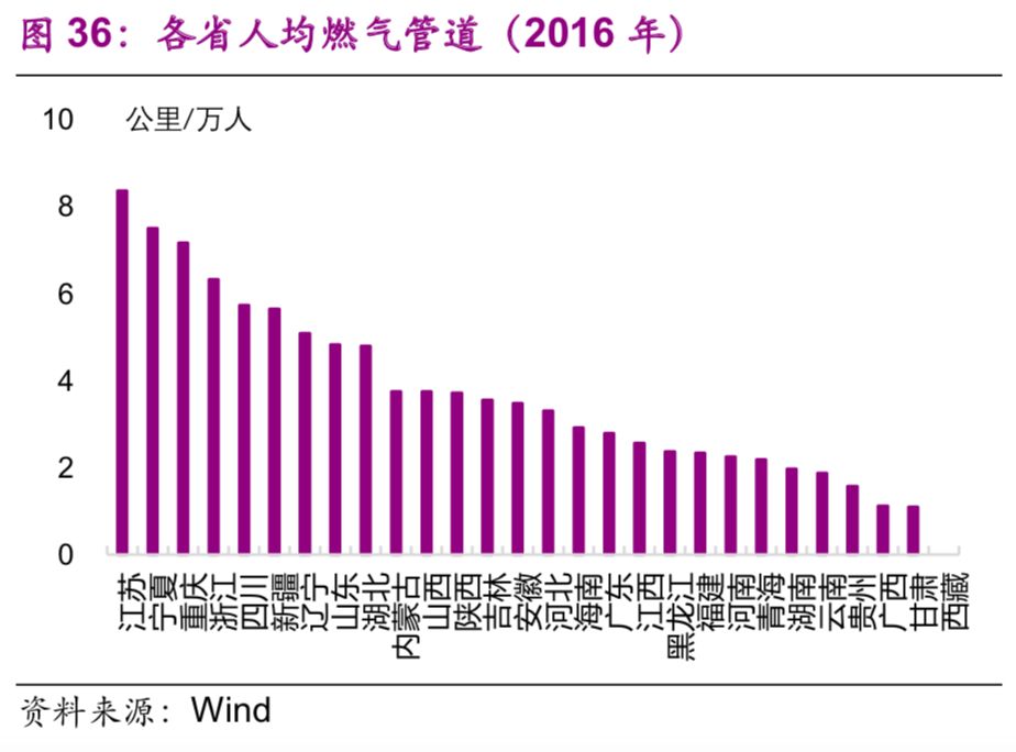 能源基礎(chǔ)設(shè)施方面,東部地區(qū)普遍高于中西部地區(qū)。2016年,燃?xì)夤艿烂芏扰琶叭氖墙K(0.65公里/平方公里)、浙江(0.35公里/平方公里)、山東(0.31公里/平方公里)(圖35);人均燃?xì)夤艿繹22]排名前三的也是浙江(8.4公里/萬人)、寧夏(7.5公里/萬人)、重慶(7.2公里/萬人)(圖36)。