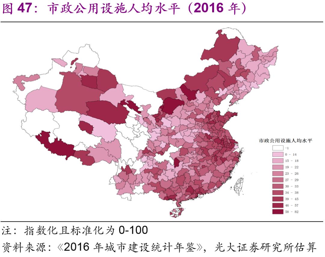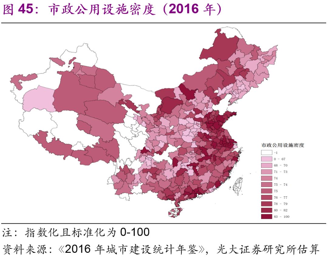 城市市政公用設(shè)施投資結(jié)構(gòu)不斷變化。隨著中國城鎮(zhèn)化的不斷推進(jìn),2016年投資額達(dá)1.7萬億元的城市市政公用設(shè)施投資結(jié)構(gòu)有了較大變化:1990年占據(jù)較大比重的燃?xì)猓?6%)、供水(20%)隨著滲透率觸及“天花板[26]”后比重下降較快,兩者2016年的比重分別為2%、3%;而更能體現(xiàn)城市功能升級的公共交通、道路橋梁等的比重上升較快,1990年兩者的比重分別為8%、26%,2016年則分別為23%、43%;此外,許多新型的城市市政公用設(shè)施投資開始出現(xiàn),例如地下綜合管廊,2016年占比達(dá)到了1.7%(圖44)。